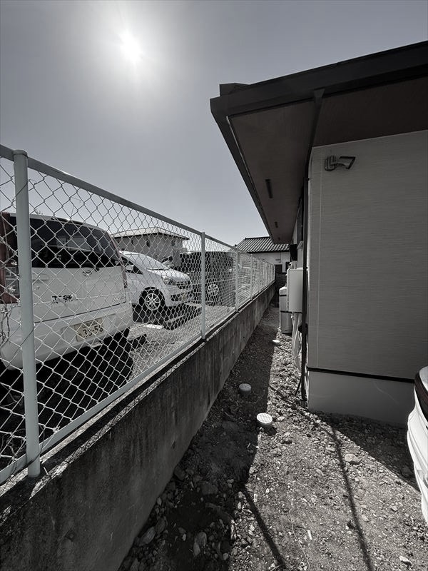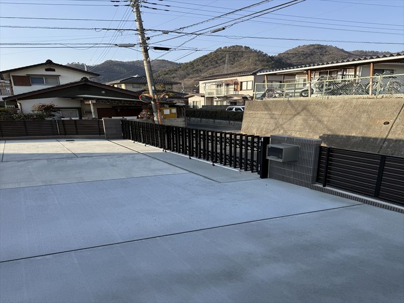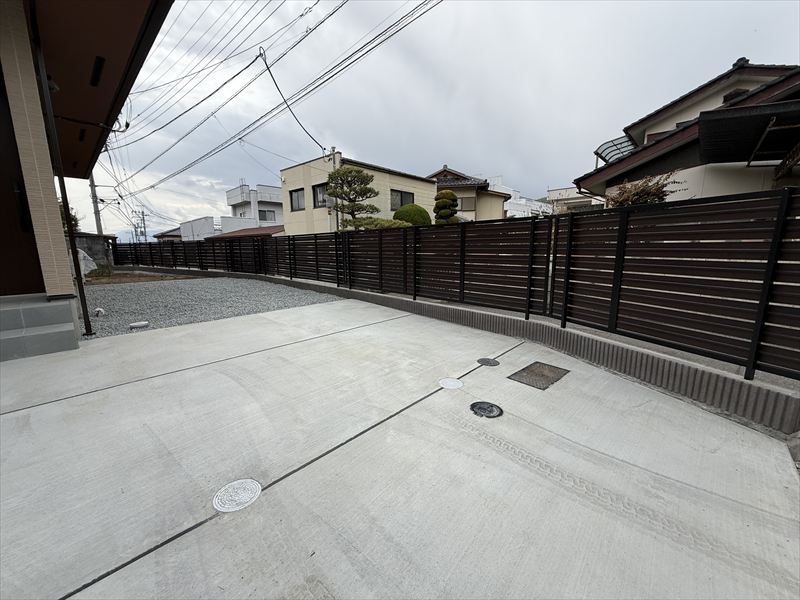 フェンスと組み合わせることで、角地特有の不安を軽減しています。敷地内部は駐車しやすさを重視した土間コンクリート仕上げ。