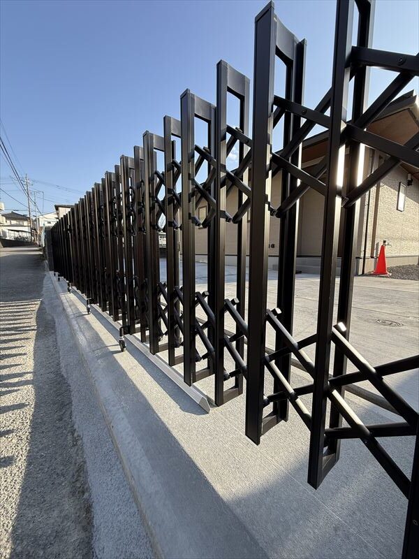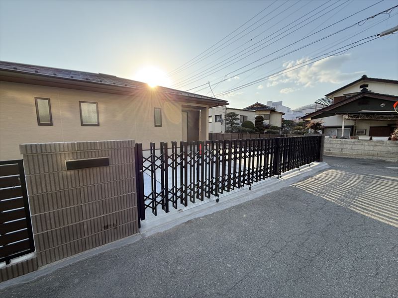 角地ならではの開放感がある一方で、防犯面や飛び出しが気になる外構計画。今回は敷地条件を活かしながら、伸縮門扉とフェンスを設置することで安心感のある外構に仕上げました。道路に面する部分には伸縮門扉を設け、必要な時だけしっかりクローズ。